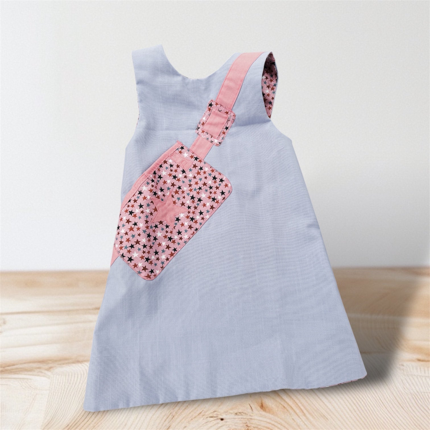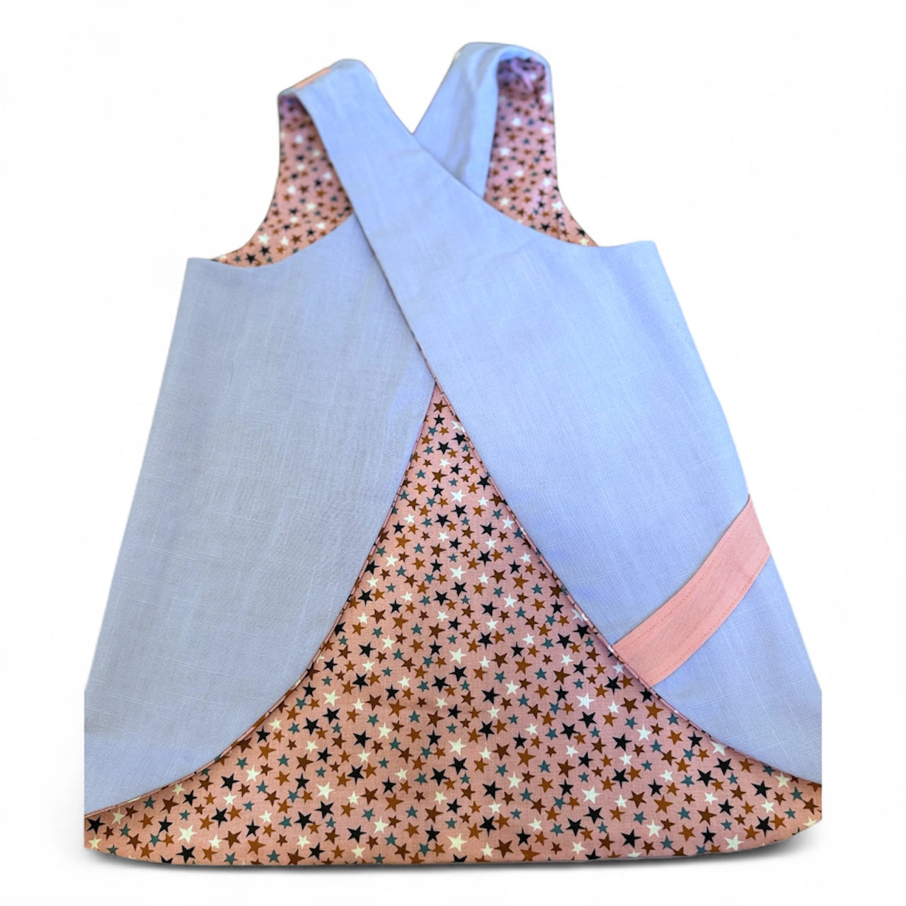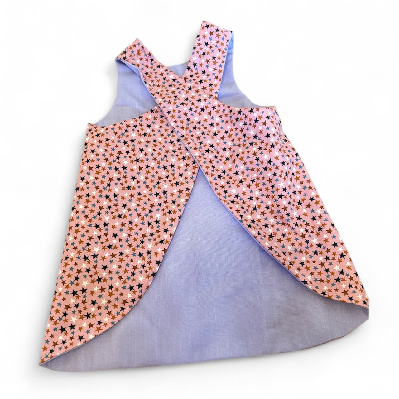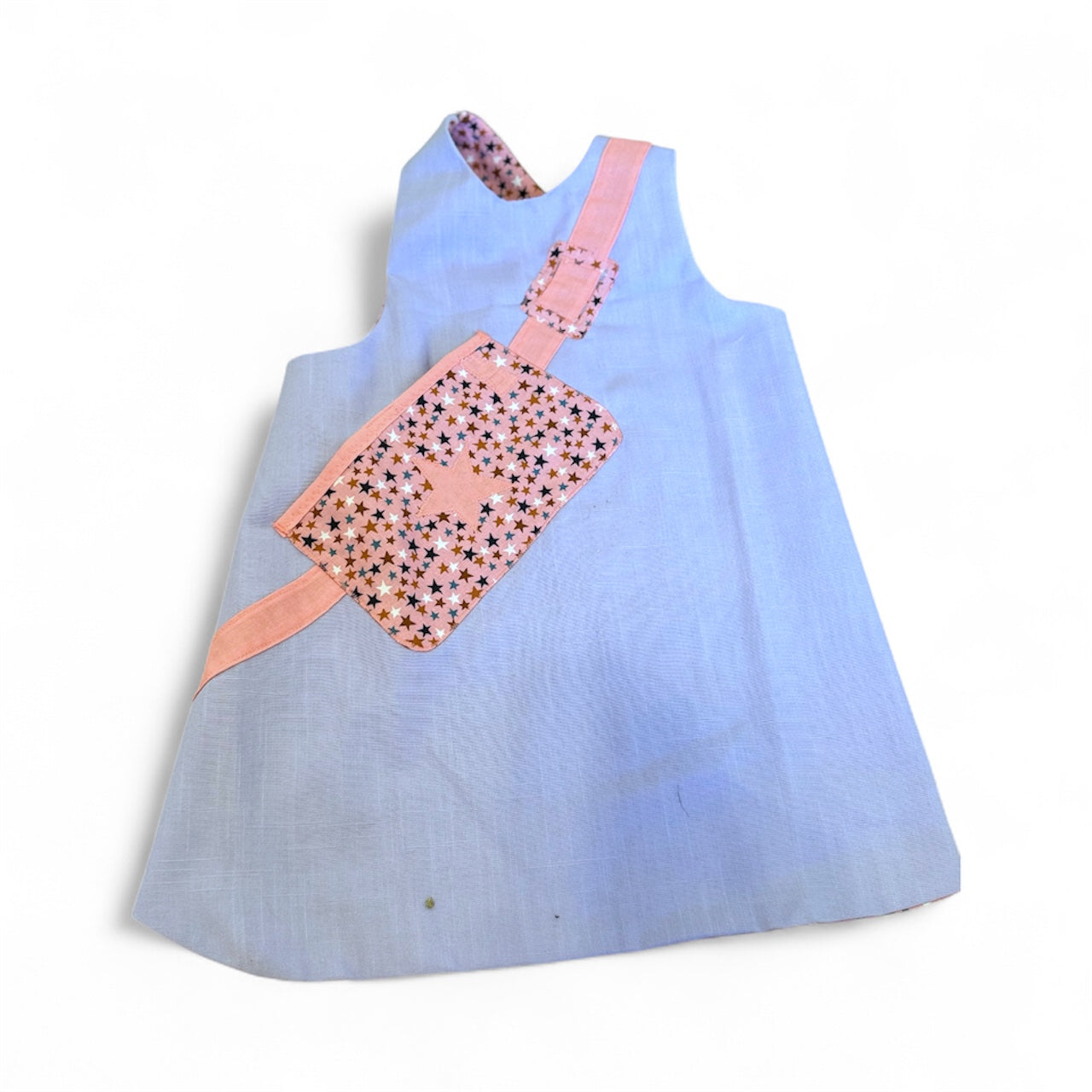 For the little bag lover who loves to sparkle! This adorable apron features a soft purple cotton front with a playful pink star-print back — giving your little one two fun looks in one. The “crossbody bag” detail isn’t just for show — it’s a functional pocket with a Velcro closure, perfect for storing tiny treasures or pretend essentials.